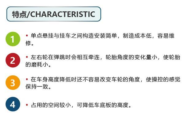 2、左右輪在彈跳時(shí)會(huì)相互牽連,輪胎角度的變化量小,使輪胎的磨耗小。