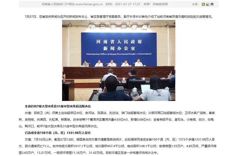 據(jù)河南省政府發(fā)布,強(qiáng)降水造成7月16日以來(lái),截至27日12時(shí),據(jù)自然災(zāi)害災(zāi)情管理系統(tǒng)統(tǒng)計(jì),此輪強(qiáng)降雨造成全省150個(gè)縣(市、區(qū))1573個(gè)鄉(xiāng)鎮(zhèn)1331.98萬(wàn)人受災(zāi),因?yàn)?zāi)遇難死亡71人。農(nóng)作物受災(zāi)面積1017.1千公頃,成災(zāi)面積457.4千公頃,絕收面積148.1千公頃;倒塌房屋1.55萬(wàn)戶、4.85萬(wàn)間,嚴(yán)重?fù)p壞房屋3.65萬(wàn)戶、13.21萬(wàn)間,一般損壞房屋11.16萬(wàn)戶、31.42萬(wàn)間。